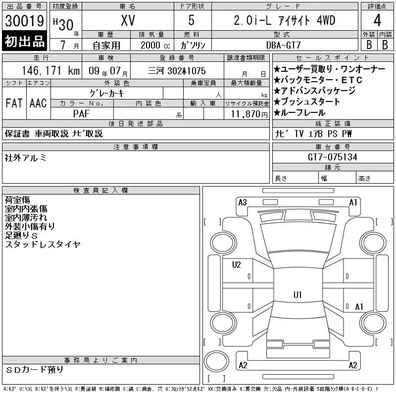 Subaru XV с аукциона Японии CAA Chubu лот № 30019