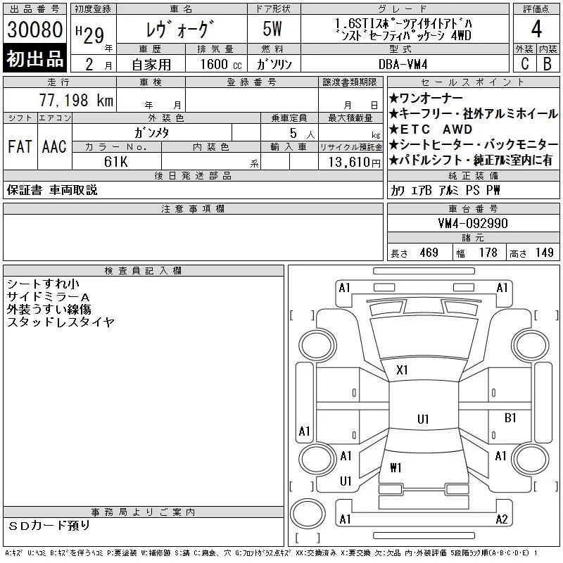 Subaru LEVORG с аукциона Японии CAA Chubu лот № 30080