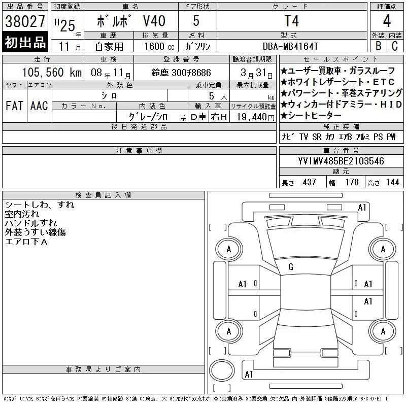 Volvo V40 с аукциона Японии CAA Chubu лот № 38027