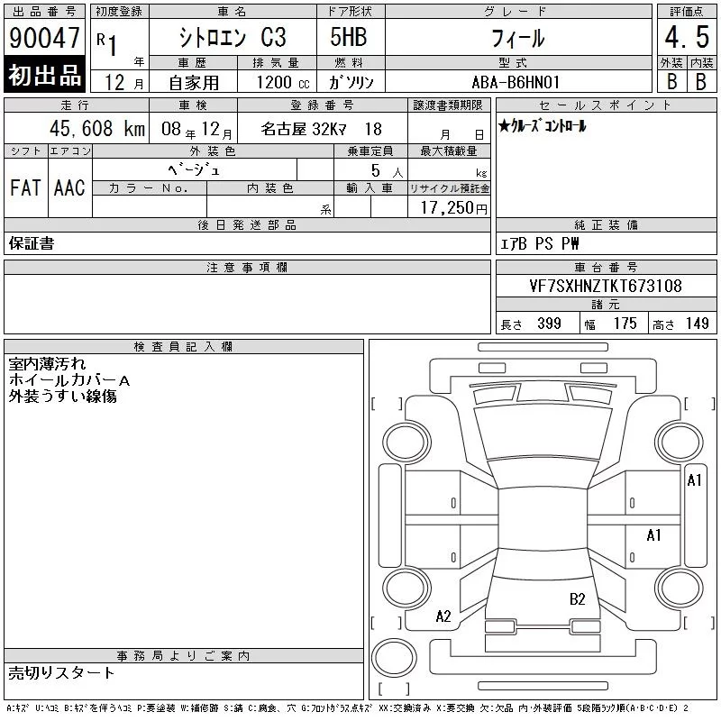 Citroen C3 с аукциона Японии CAA Chubu лот № 90047
