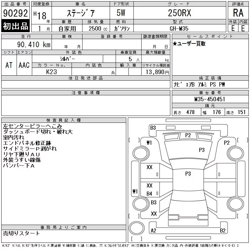 Nissan STAGEA с аукциона Японии CAA Chubu лот № 90292