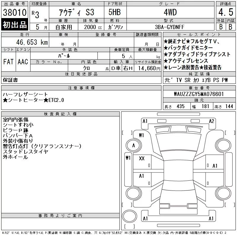 Audi S3 с аукциона Японии CAA Chubu лот № 38010