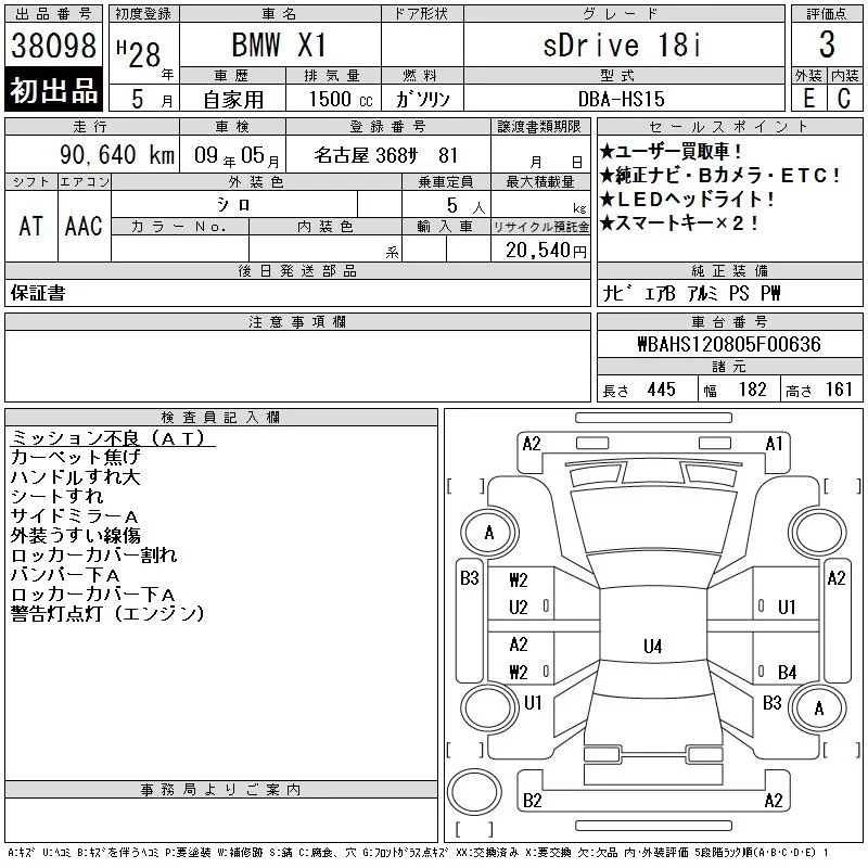 BMW X1 с аукциона Японии CAA Chubu лот № 38098
