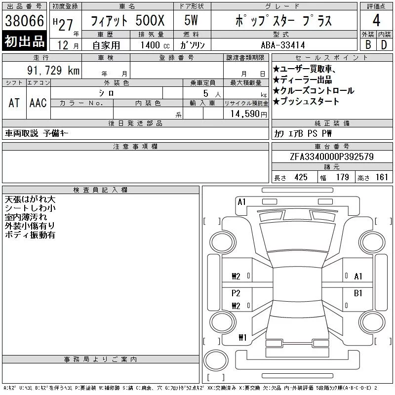 Fiat 500X с аукциона Японии CAA Chubu лот № 38066