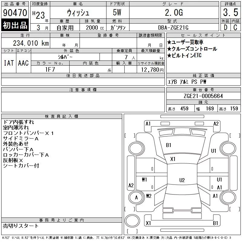 Toyota WISH с аукциона Японии CAA Chubu лот № 90470