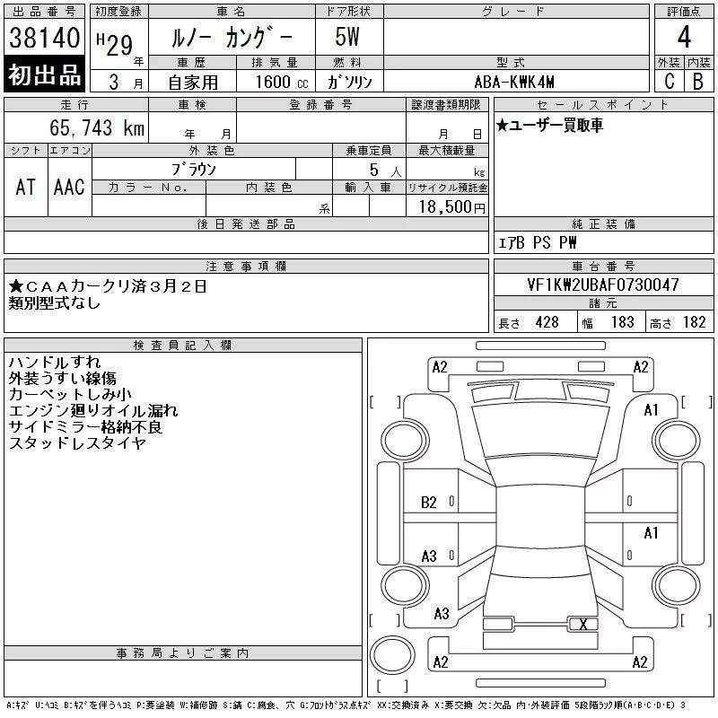 Renault KANGOO с аукциона Японии CAA Chubu лот № 38140