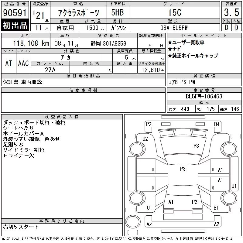 Mazda AXELA с аукциона Японии CAA Chubu лот № 90591