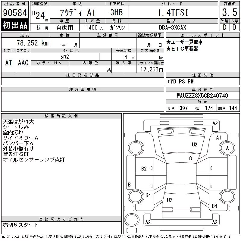 Audi A1 с аукциона Японии CAA Chubu лот № 90584