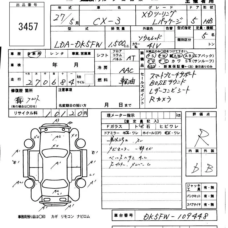Mazda CX-3 с аукциона Японии KCAA Minami Kyushu лот № 3457
