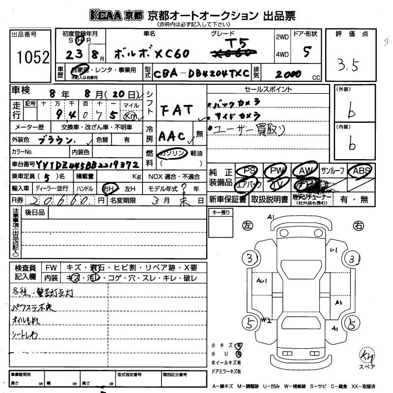 Volvo XC60 с аукциона Японии KCAA Kyoto лот № 1052