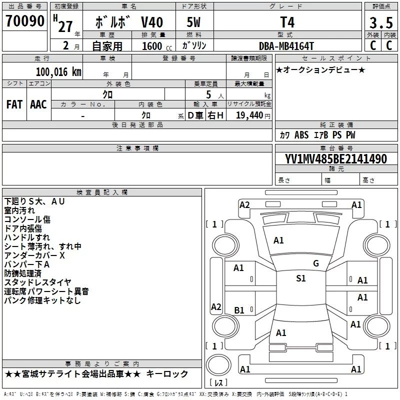Volvo V40 с аукциона Японии TAA Tohoku лот № 70090