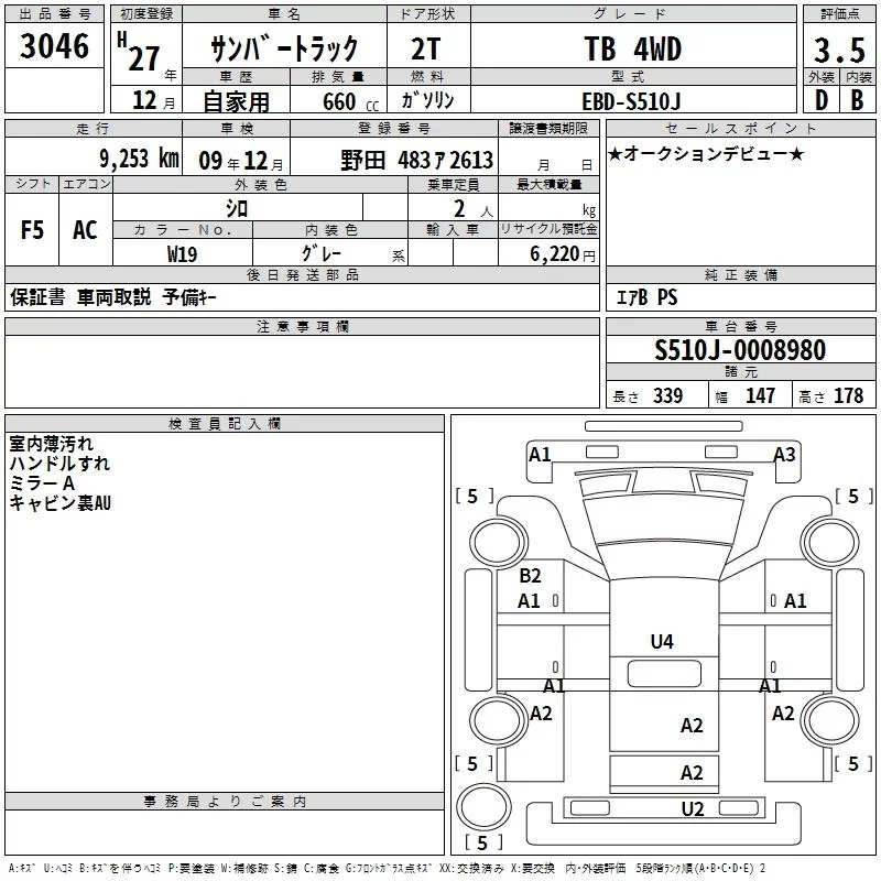 Subaru SAMBAR с аукциона Японии TAA Kanto лот № 3046