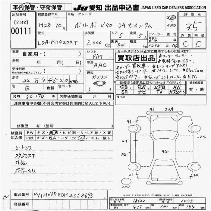 Volvo V40 с аукциона Японии JU Aichi лот № 111