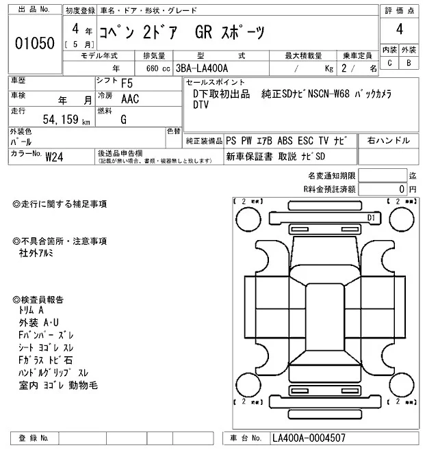 Toyota COPEN с аукциона Японии ARAI Oyama лот № 1050