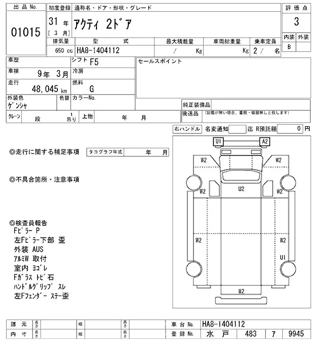 Honda ACTY TRUCK с аукциона Японии ARAI Oyama лот № 1015