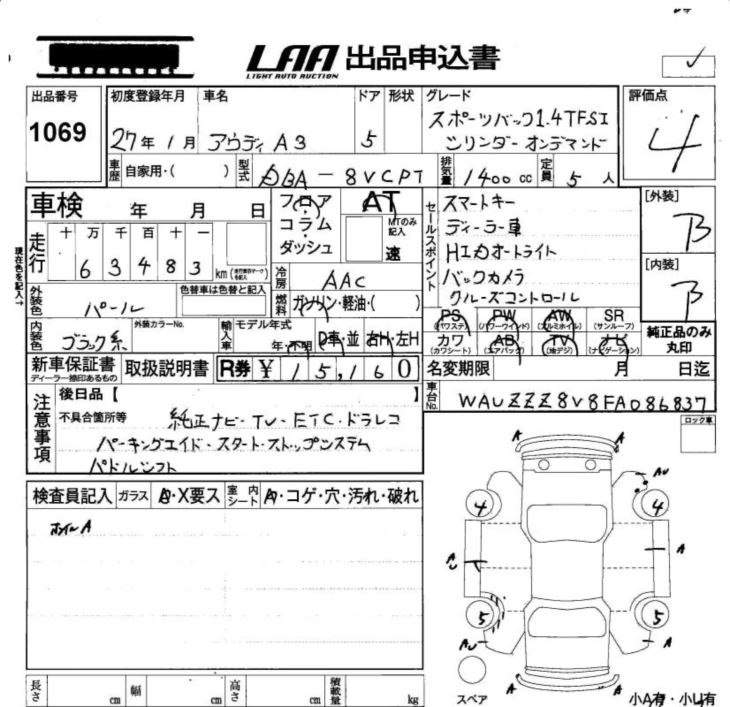 Audi A3 с аукциона Японии LAA Okayama лот № 1069