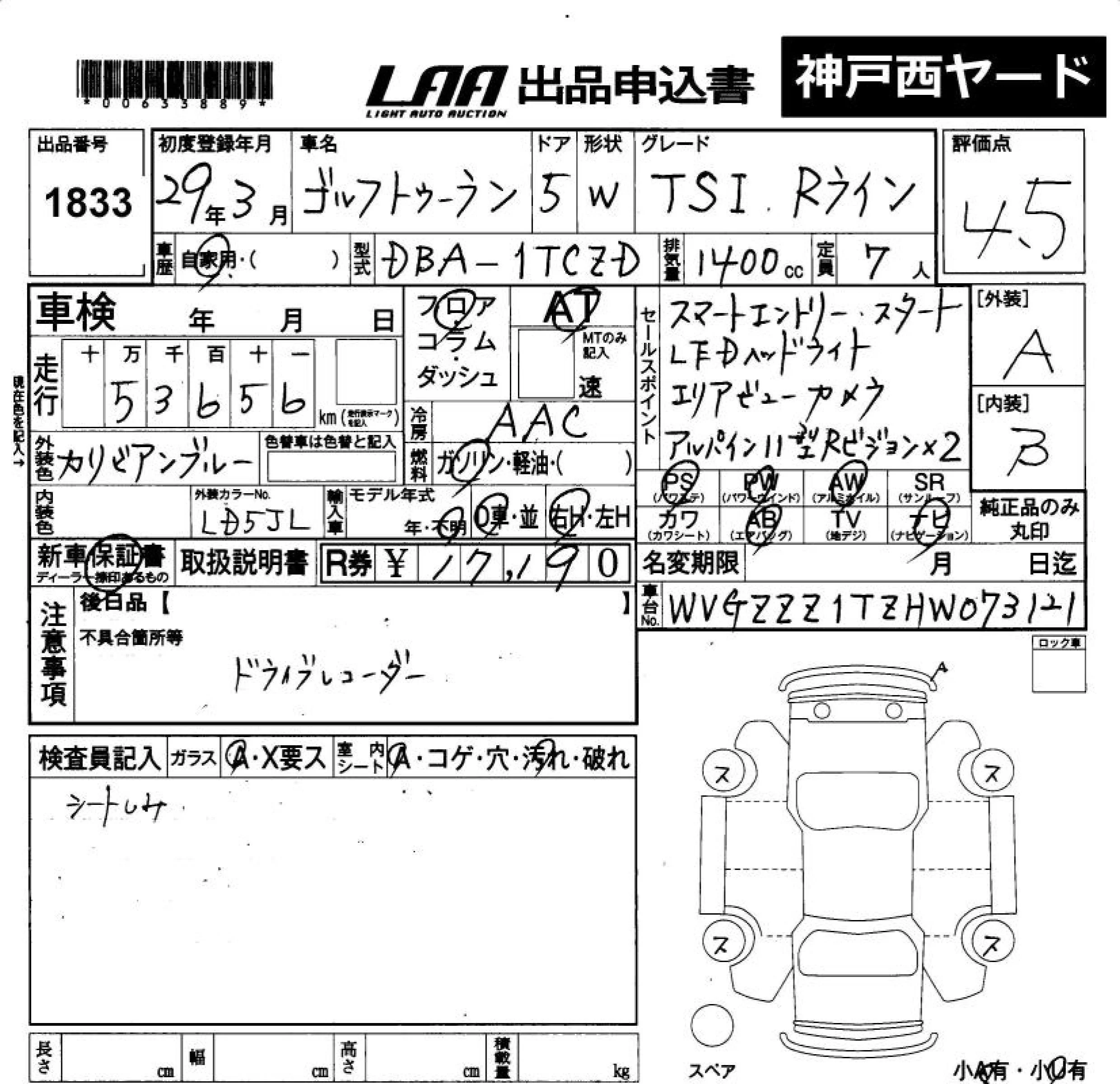 Volkswagen GOLF TOURAN с аукциона Японии LAA Okayama лот № 1833