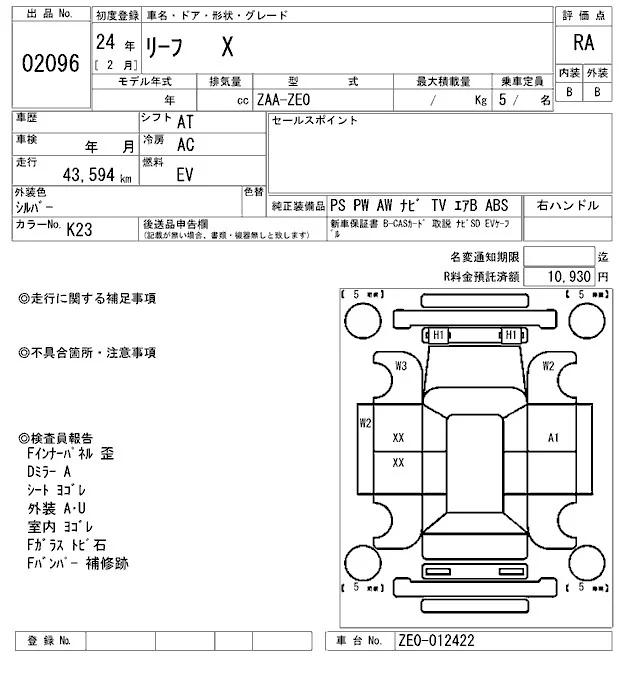 Nissan LEAF с аукциона Японии ARAI Bayside лот № 2096