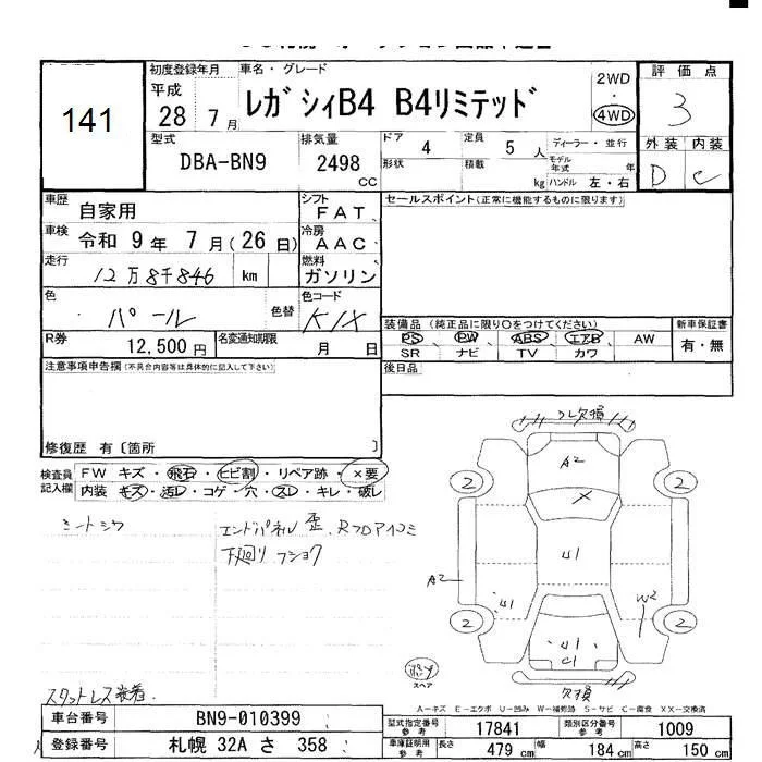 Subaru LEGACY B4 с аукциона Японии JU Hokkaido лот № 141