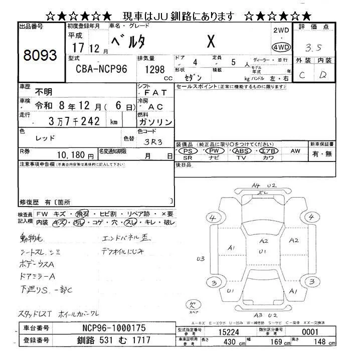 Toyota BELTA с аукциона Японии JU Hokkaido лот № 8093