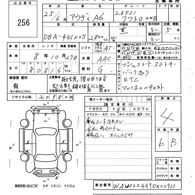 Audi A6 с аукциона Японии KCAA Yamaguchi лот № 256