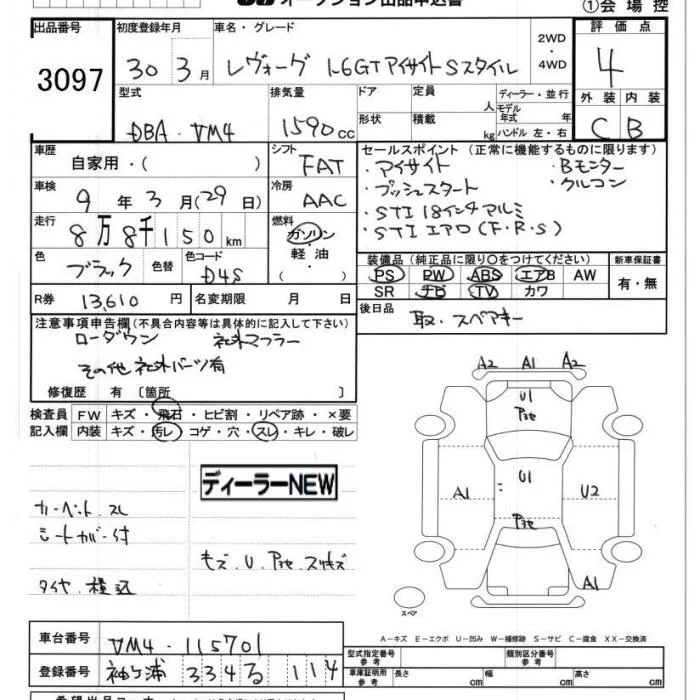 Subaru LEVORG с аукциона Японии JU Chiba лот № 3097