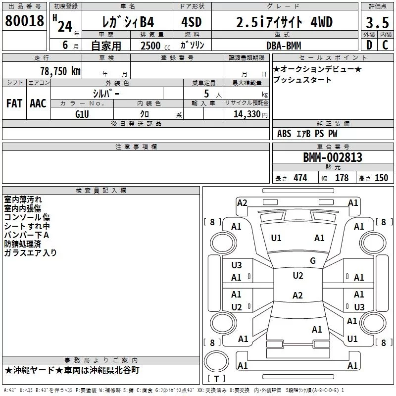 Subaru LEGACY B4 с аукциона Японии TAA Yokohama лот № 80018