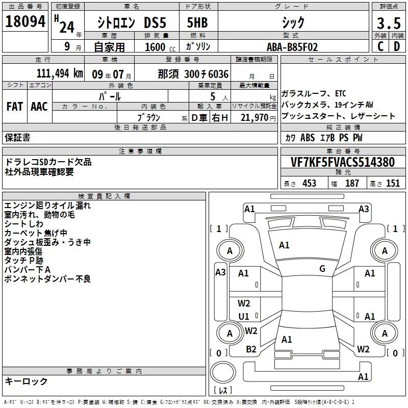 Citroen DS5 с аукциона Японии TAA Yokohama лот № 18094