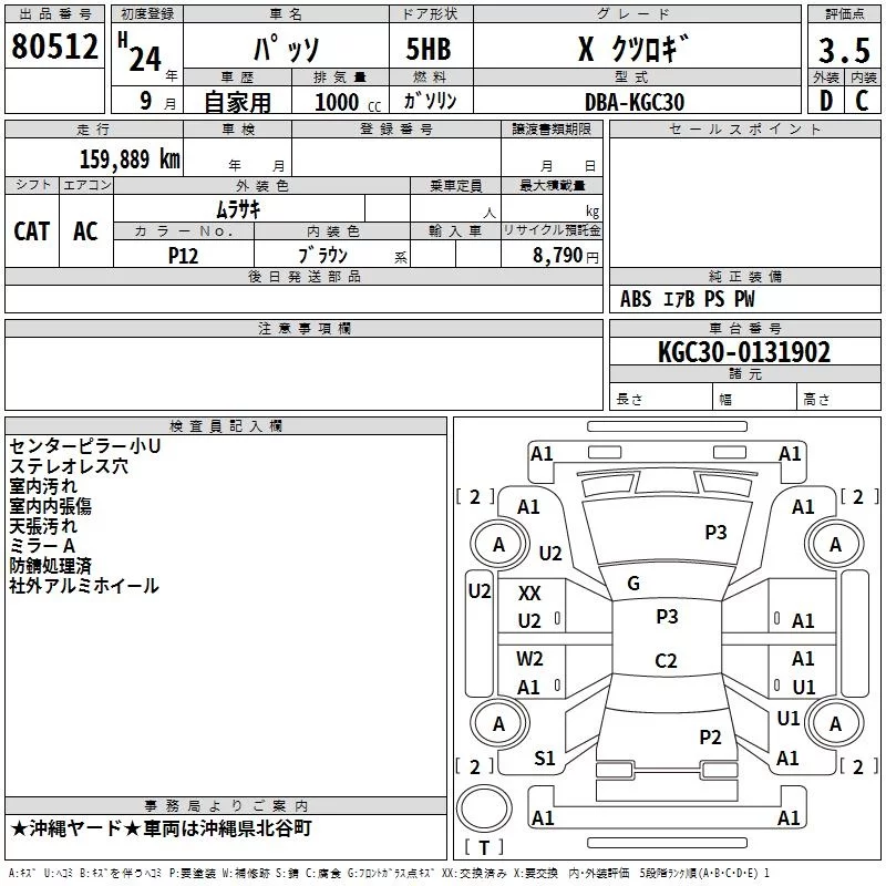 Toyota PASSO с аукциона Японии TAA Yokohama лот № 80512