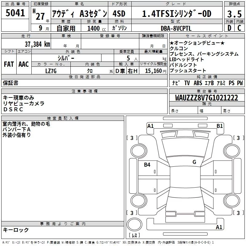 Audi A3 с аукциона Японии TAA Yokohama лот № 5041