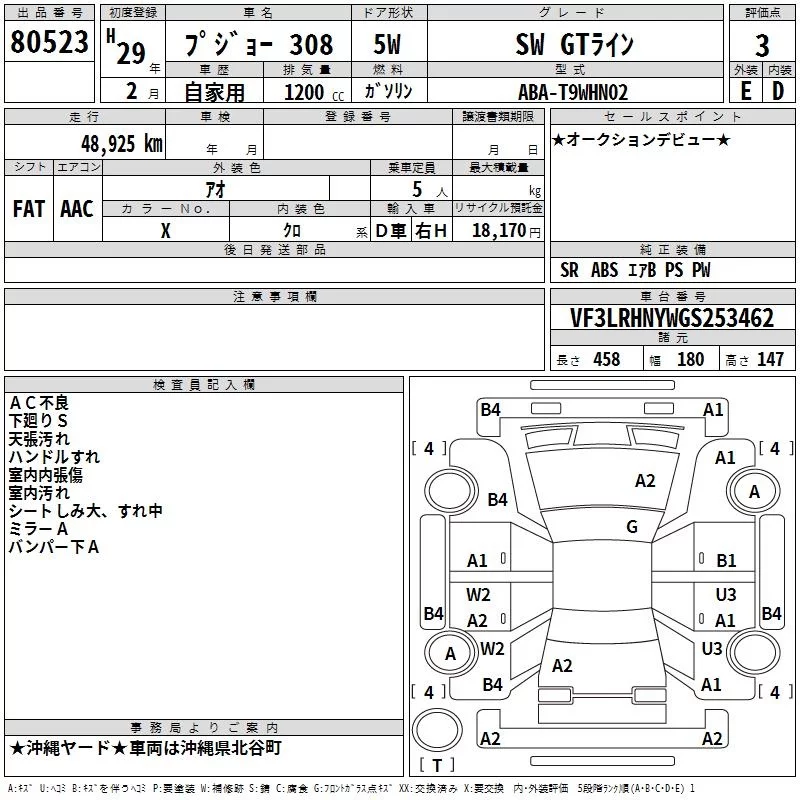 Peugeot 308 с аукциона Японии TAA Yokohama лот № 80523