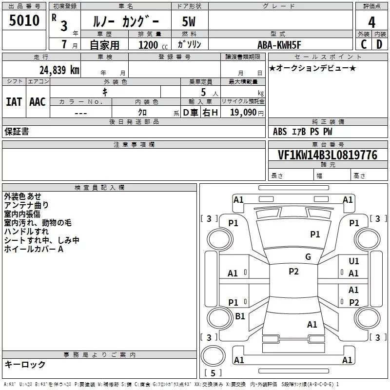 Renault KANGOO с аукциона Японии TAA Yokohama лот № 5010
