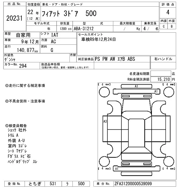 Fiat 500 с аукциона Японии ARAI Oyama VT лот № 20231