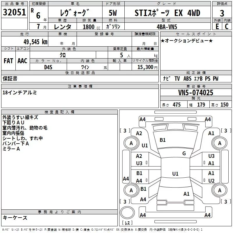 Subaru LEVORG с аукциона Японии TAA Yokohama лот № 32051