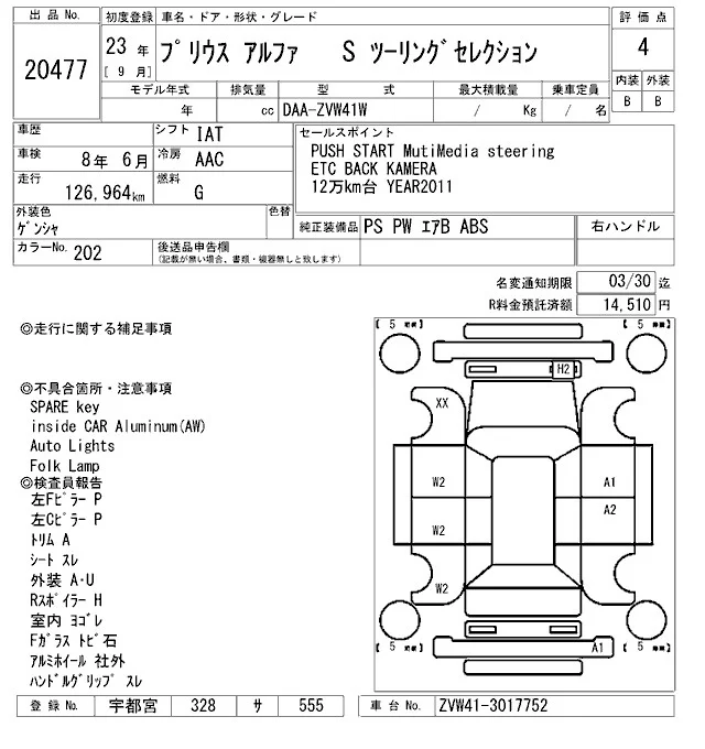 Toyota PRIUS ALPHA с аукциона Японии ARAI Oyama VT лот № 20477