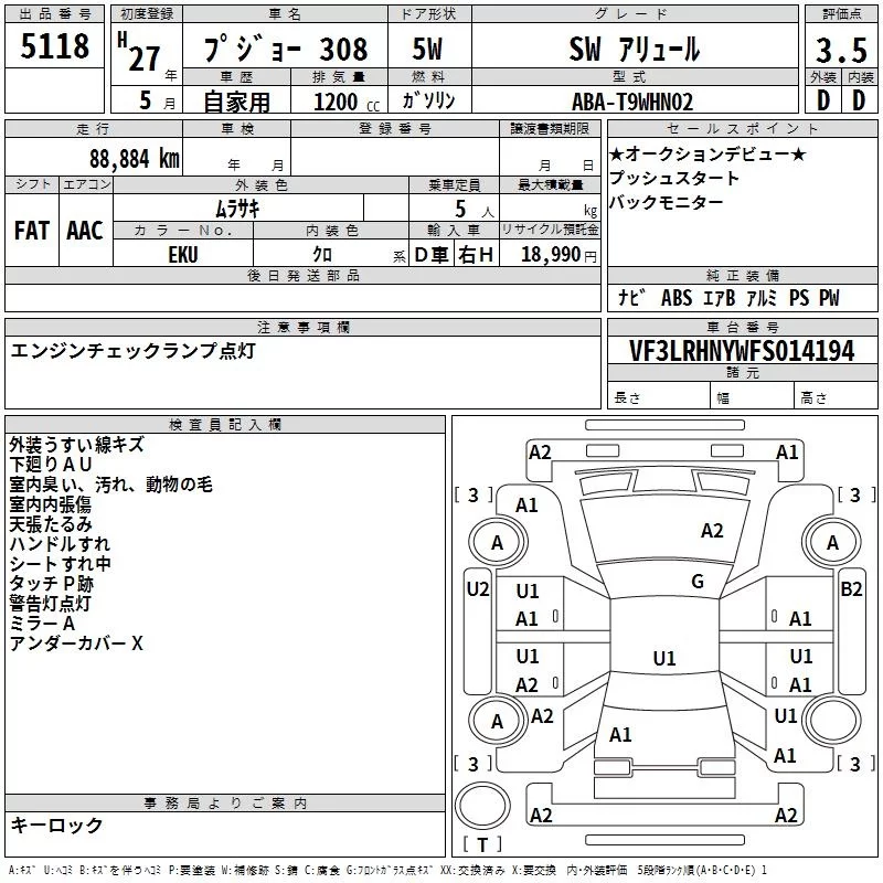 Peugeot 308 с аукциона Японии TAA Yokohama лот № 5118