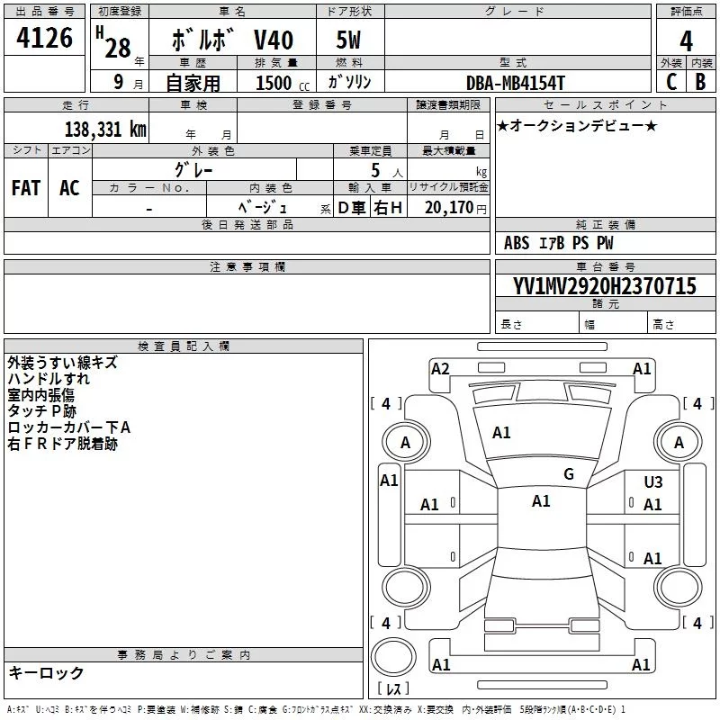 Volvo V40 с аукциона Японии TAA Hyogo лот № 4126