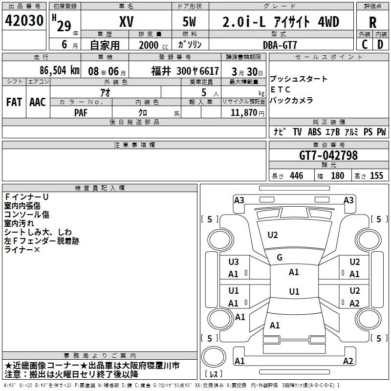 Subaru XV с аукциона Японии TAA Hyogo лот № 42030