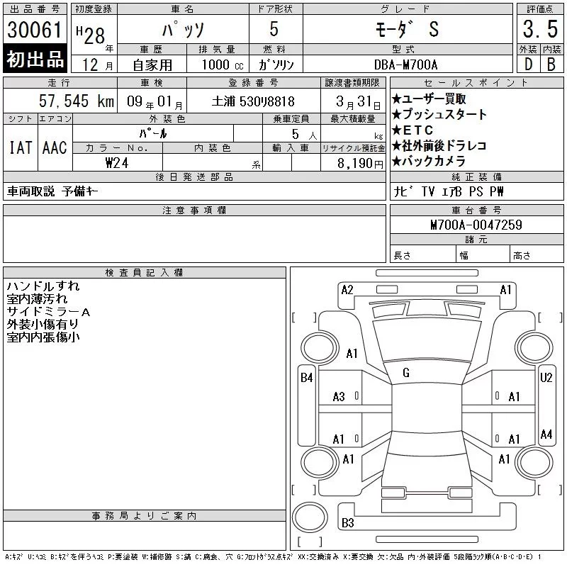 Toyota PASSO с аукциона Японии CAA Tokyo лот № 30061