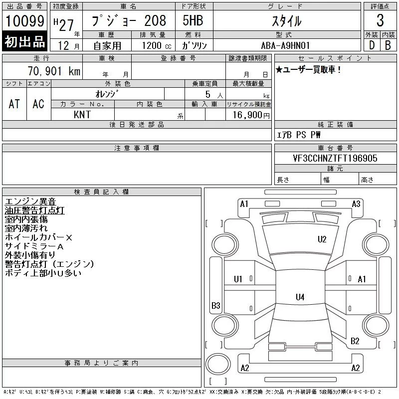 Peugeot 208 с аукциона Японии CAA Tokyo лот № 10099