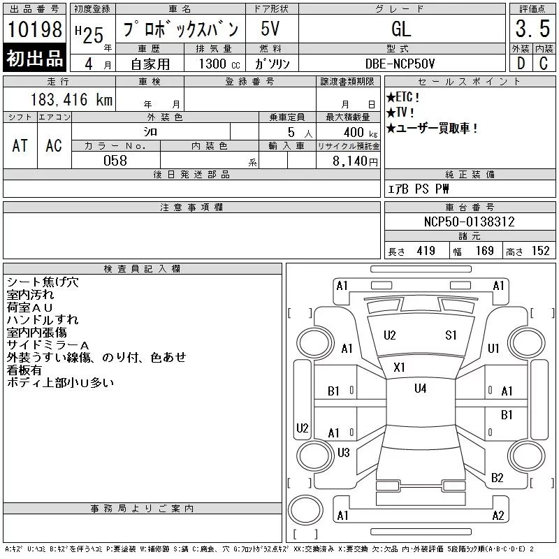 Toyota PROBOX с аукциона Японии CAA Tokyo лот № 10198