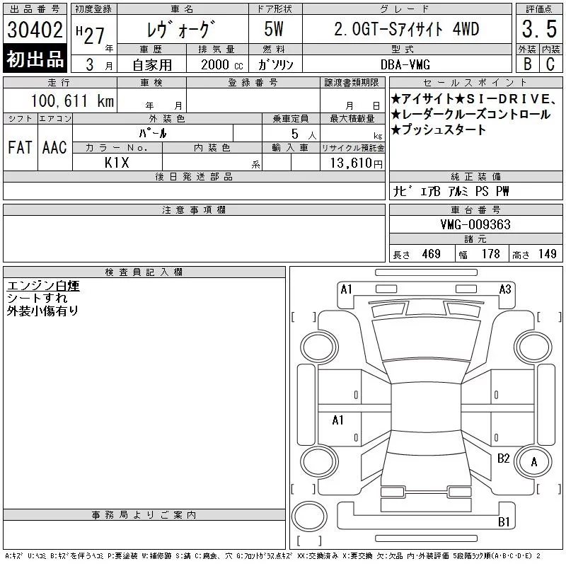 Subaru LEVORG с аукциона Японии CAA Tokyo лот № 30402
