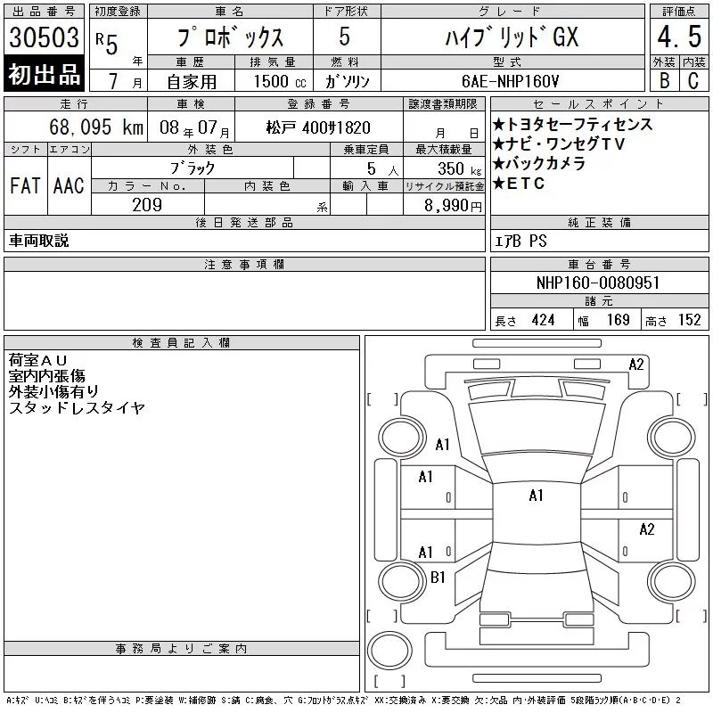 Toyota PROBOX с аукциона Японии CAA Tokyo лот № 30503