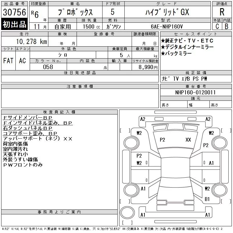 Toyota PROBOX с аукциона Японии CAA Tokyo лот № 30756