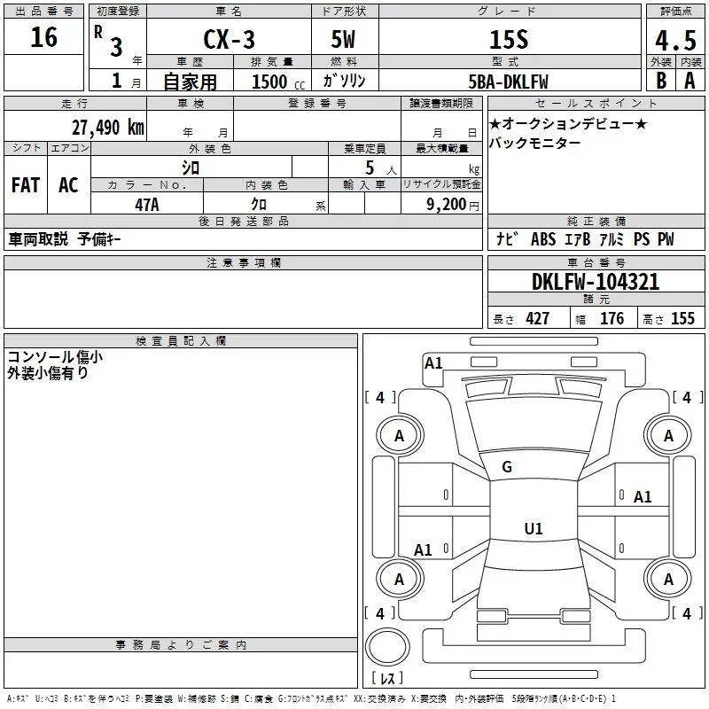 Mazda CX-3 с аукциона Японии TAA Shikoku лот № 16