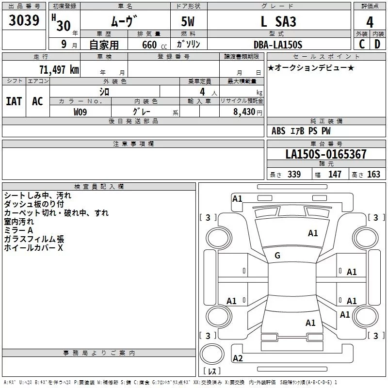 Daihatsu MOVE с аукциона Японии TAA Shikoku лот № 3039