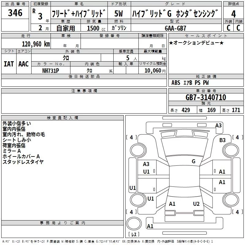 Honda FREED с аукциона Японии TAA Kinki лот № 346