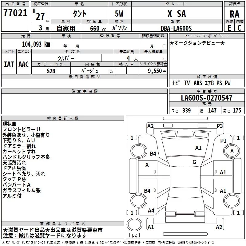 Daihatsu TANTO с аукциона Японии TAA Kinki лот № 77021