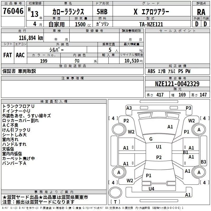 Toyota COROLLA RUNX с аукциона Японии TAA Kinki лот № 76046