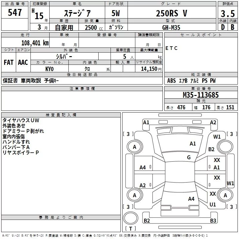 Nissan STAGEA с аукциона Японии TAA Kinki лот № 547